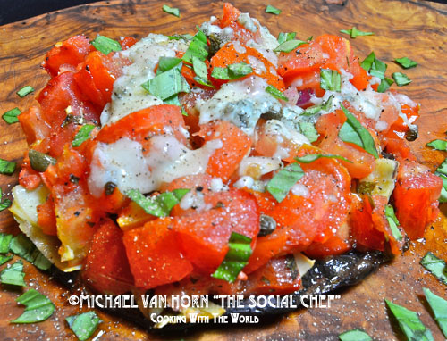 - 2. Directions: In a large glass bowl combine, tomato, capers, onion, artichoke, garlic, olives and basil. Add salt, pepper and olive oil and stir gently
